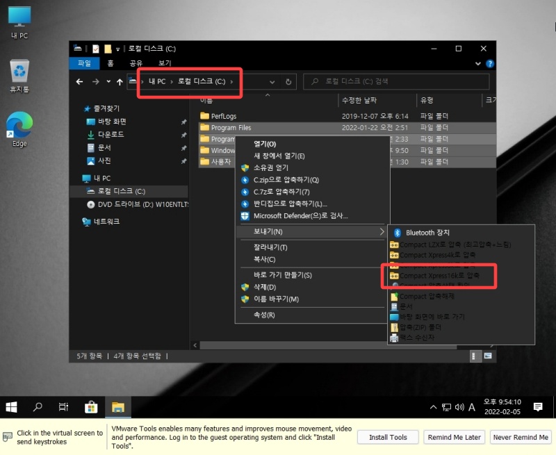 제작하신 분이 기본 기능으로 Compact OS 압축을 넣어 주셨습니다. 이를 이용하면 시스템 파일을 압축해서 용량을 확보할 수 있습니다. C드라이브에 있는 4개 폴더(스샷 참고)를 선택하고 마우스 오른쪽->보내기->Compact Xpress 16K로 압축 을 클릭하시면 됩니다.
