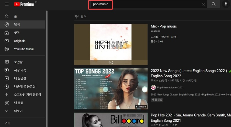 왼쪽에 있는 카테고리는 별거 없습니다. 클릭하면 해당 카테고리로 유튜브에 검색한 결과가 나옵니다.