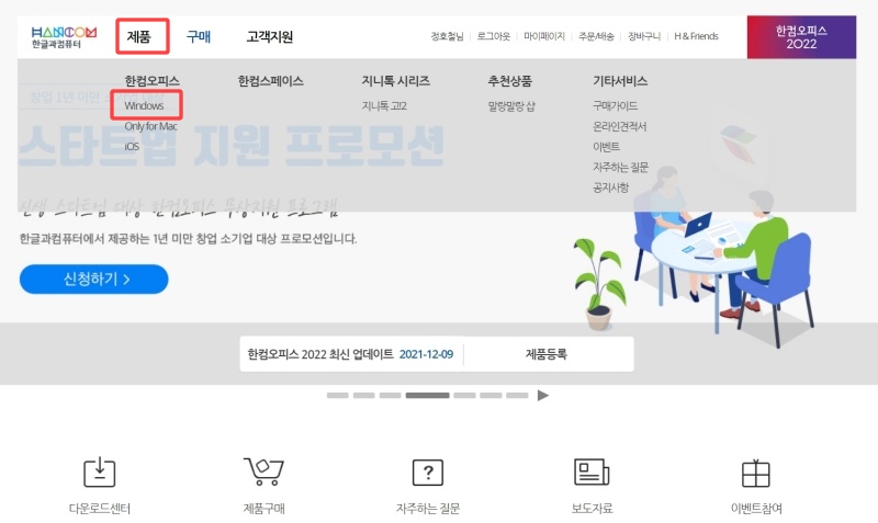 한글과 컴퓨터 홈페이지에 접속합니다. 이후 제품->한컴오피스->Windows로 이동합니다.
