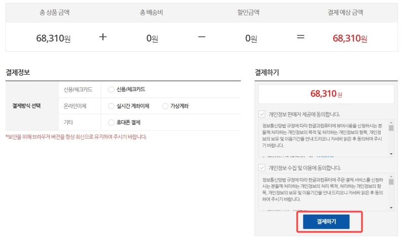한컴오피스 2022 가정 및 학생용 다운로드 버전은 68,310원 입니다. 결제정보를 입력하고 결제하기 를 클릭하면 한컴오피스 2022 구매가 완료됩니다.