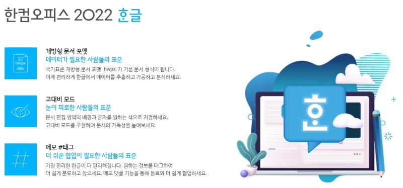한글 2022의 최신 버전입니다. 한글을 쓰는 이유는 하나죠. .hwp 파일을 편집할 수 있기 때문입니다. 공공기관에서는 한글을 주로 사용하는 만큼, 문서 편집기로서 한글을 많이 사용하고 있죠. 단순히 한글만 쓰는 용도라면 웹 버전 한글 또는 무료 버전 한글 2022를 사용해보시는 것도 추천합니다.
