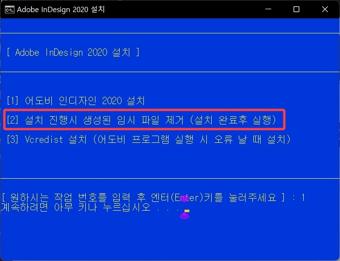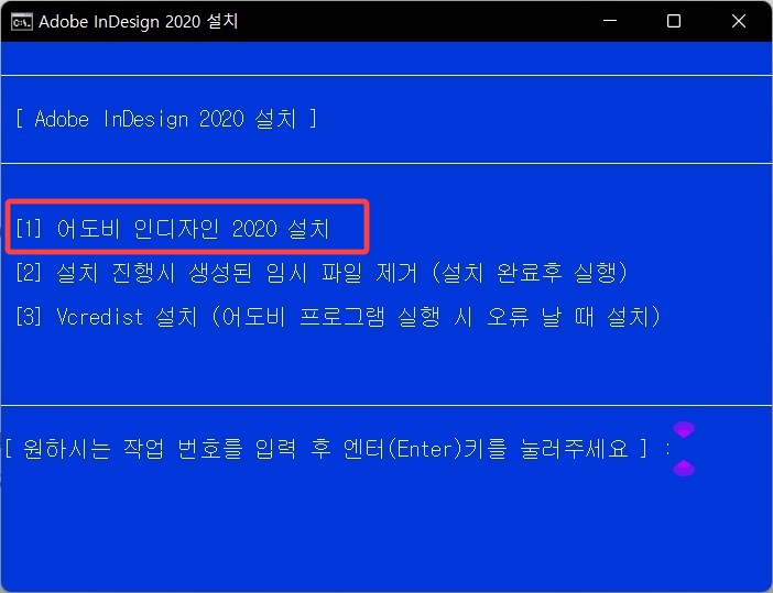 인디자인 2020 설치 창입니다. 설치는 cmd 창으로 이루어집니다. 설치를 하려면 1을 입력 후 엔터 를 누르면 자동으로 어도비 프로그램 설치가 시작됩니다.