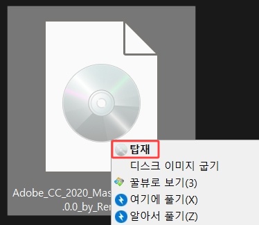 다운받은 Adobe_CC_2020_Master_Collection_v4.0.0_by_Remiz.iso 파일을 마우스 오른쪽 클릭한 뒤 탑재 를 클릭합니다.