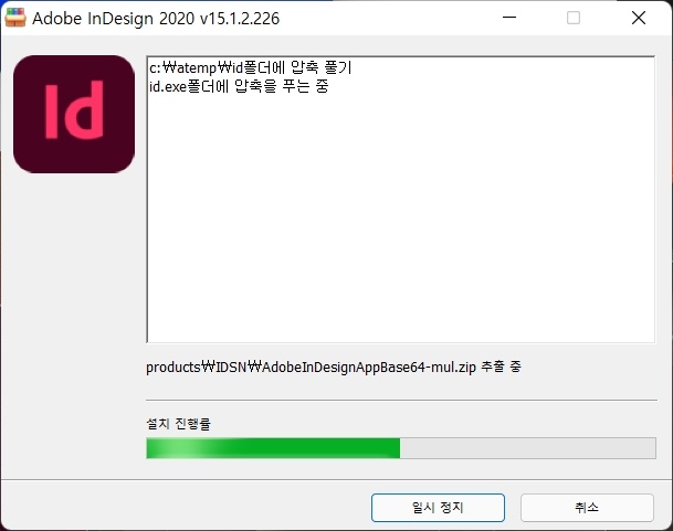 인디자인 설치 프로그램의 압축을 자동으로 풉니다. 시간은 30초 정도 걸립니다.