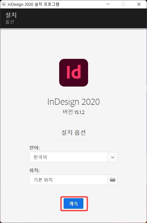 인디자인 2020 설치 프로그램 창입니다. 설치하고 싶은 언어와 설치 위치를 선택한 후 계속 을 클릭합니다.
