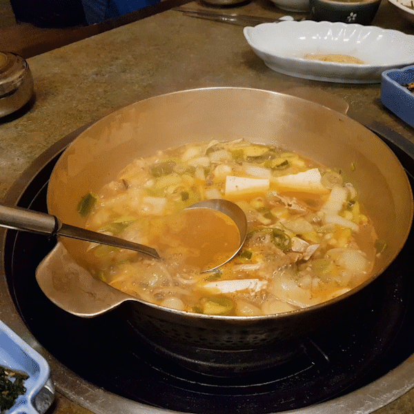 된장 전골입니다. 밥도 같이 나오는데, 코스요리인 점을 고려해 반공기만 나옵니다. 물론 밥 더 달라고 하면 줍니다.