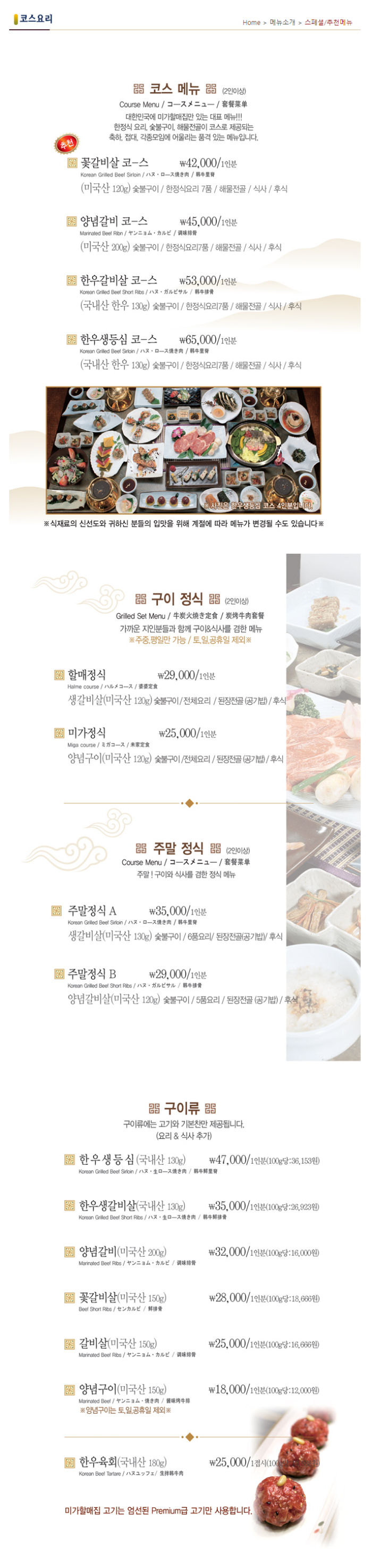 메뉴는 코스요리(코스메뉴, 구이정식, 주말정식, 구이류)와 식사(점심특선, 식사류)로 나누어져 있습니다. 메뉴는 글 하단에 첨부했습니다.