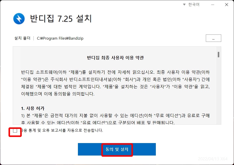 반디집 설치 기본 약관입니다. 항목에 체크 하고 동의 및 설치 를 누릅니다.