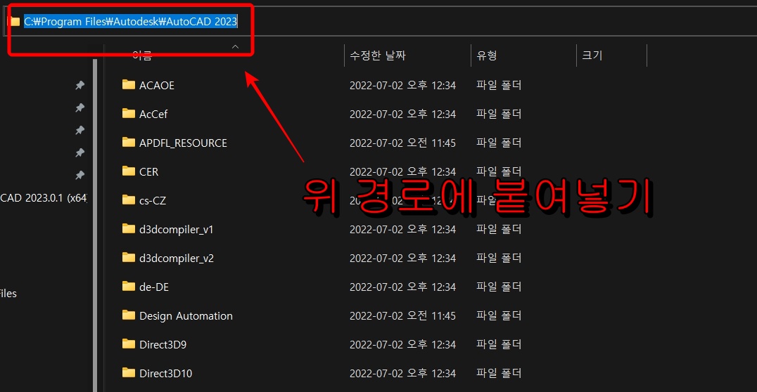 크랙을 다운받았으면 크랙 파일을 C:\Program Files\Autodesk\AutoCAD 2023 경로에 붙여넣기를 합니다.