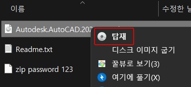 폴더 내에 있는 Autodesk.AutoCAD.2023.0.1 [FileCR] 파일을 오른쪽 마우스 클릭하고 탑재 를 클릭합니다.