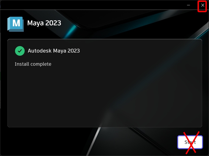 Install complete창이 뜨면 Start를 누르지 말고 우측 상단 X를 누릅니다. 아직 마야 2023을 실행하면 안됩니다.