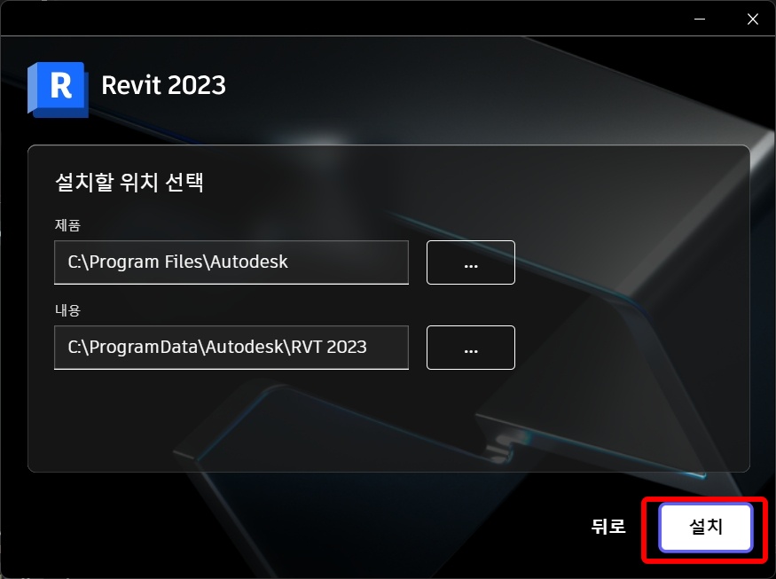 Revit 2023 설치 프로그램입니다. 설치할 위치를 선택한 후에 설치 를 클릭합니다. Revit 2023은 파일 용량이 크기 때문에 설치에 시간이 걸립니다.