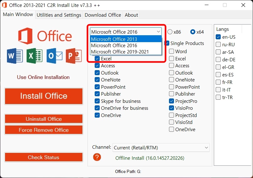 실행화면 입니다. Office 2013부터 2021까지 설치 가능합니다.
