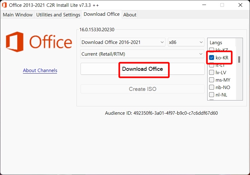 한국어 Office 2019는 Download Office 탭에서 Langs를 ko-KR로 설정한 뒤 Download Office를 실행하시면 됩니다.