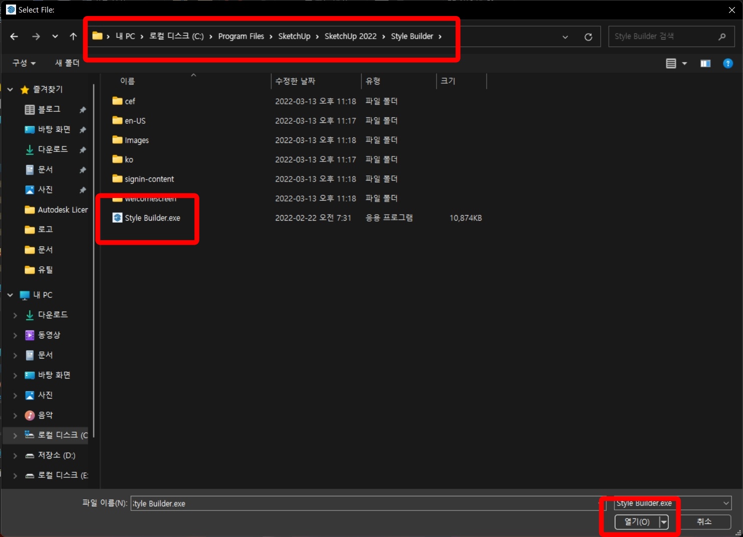 3번째는 C:\Program Files\SketchUp\SketchUp 2022\Style Builder에 있는 Style Builder.exe 파일입니다.