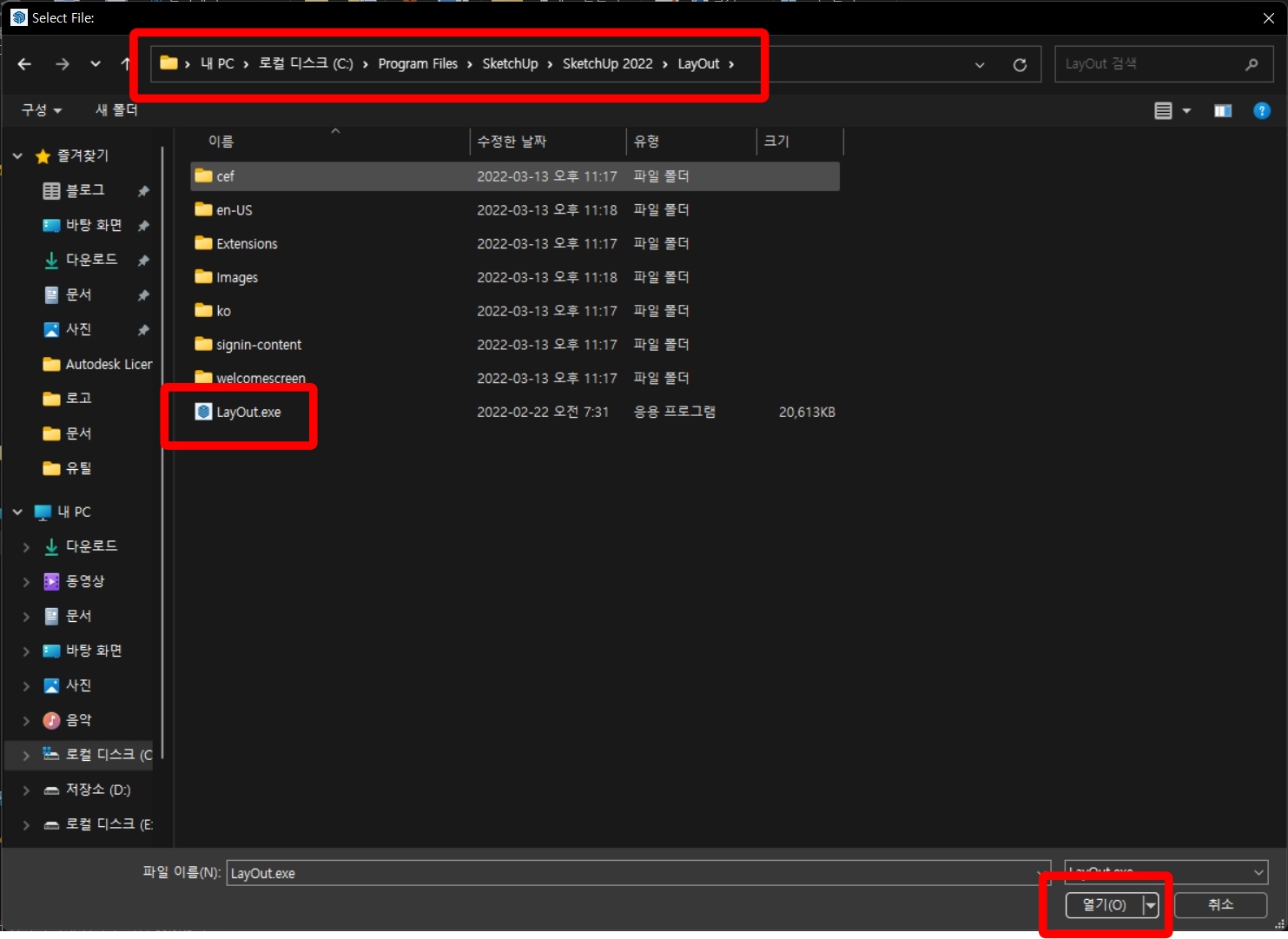 2번째는 C:\Program Files\SketchUp\SketchUp 2022\LayOut 에 있는 Layout.exe 파일입니다.