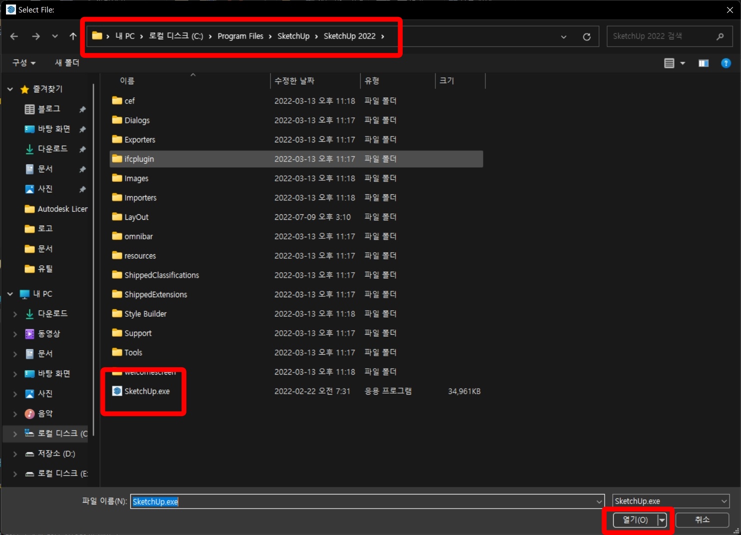 1번째는 C:\Program Files\SketchUp\SketchUp 2022 에 있는 Sketchup.exe파일입니다.