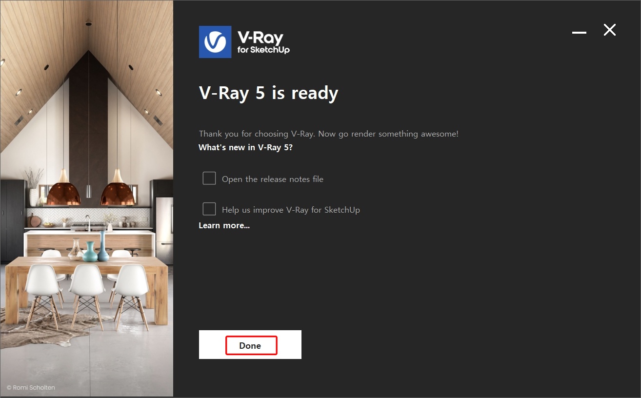 설치 프로그램입니다. 안내에 따라 브이레이 스케치업 설치를 진행합니다. 설치가 끝나면 인증을 진행합니다.