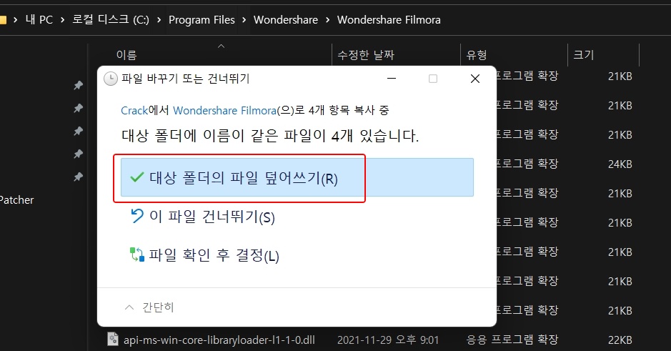 이제 필모라 X 크랙을 적용할 차례입니다. Crack 폴더에 있는 4개 파일을 복사합니다.