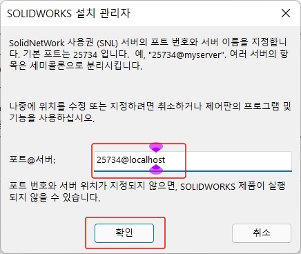 포트 서버 창이 뜨면 25734@loacalhost 를 입력하고 확인 을 누릅니다.