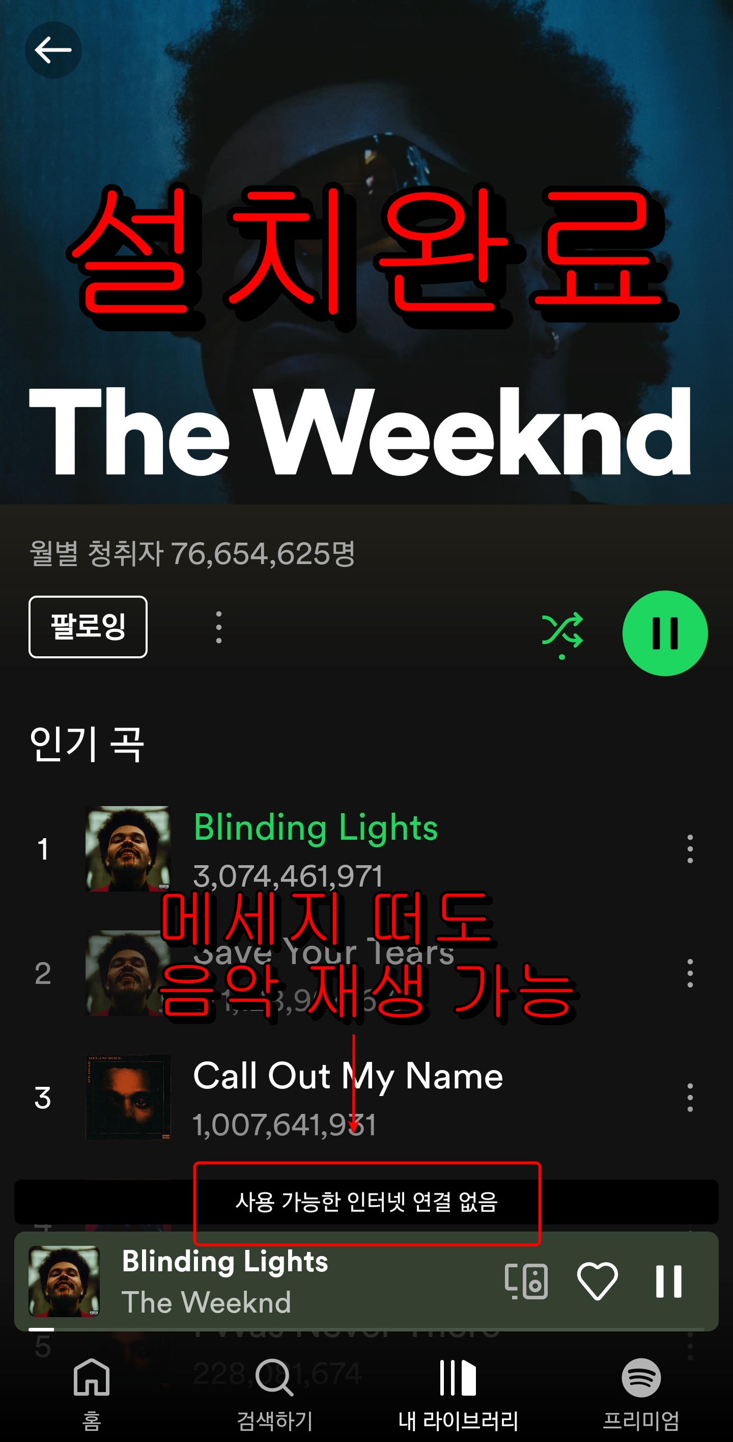 홈 하고 검색하기는 사용이 안됩니다. 내 라이브러리를 통해서 음악들을 검색할 수 있으며, 재생하면 광고 없이 음악들이 쭉 나옵니다. 기능상에는 문제 없었습니다.