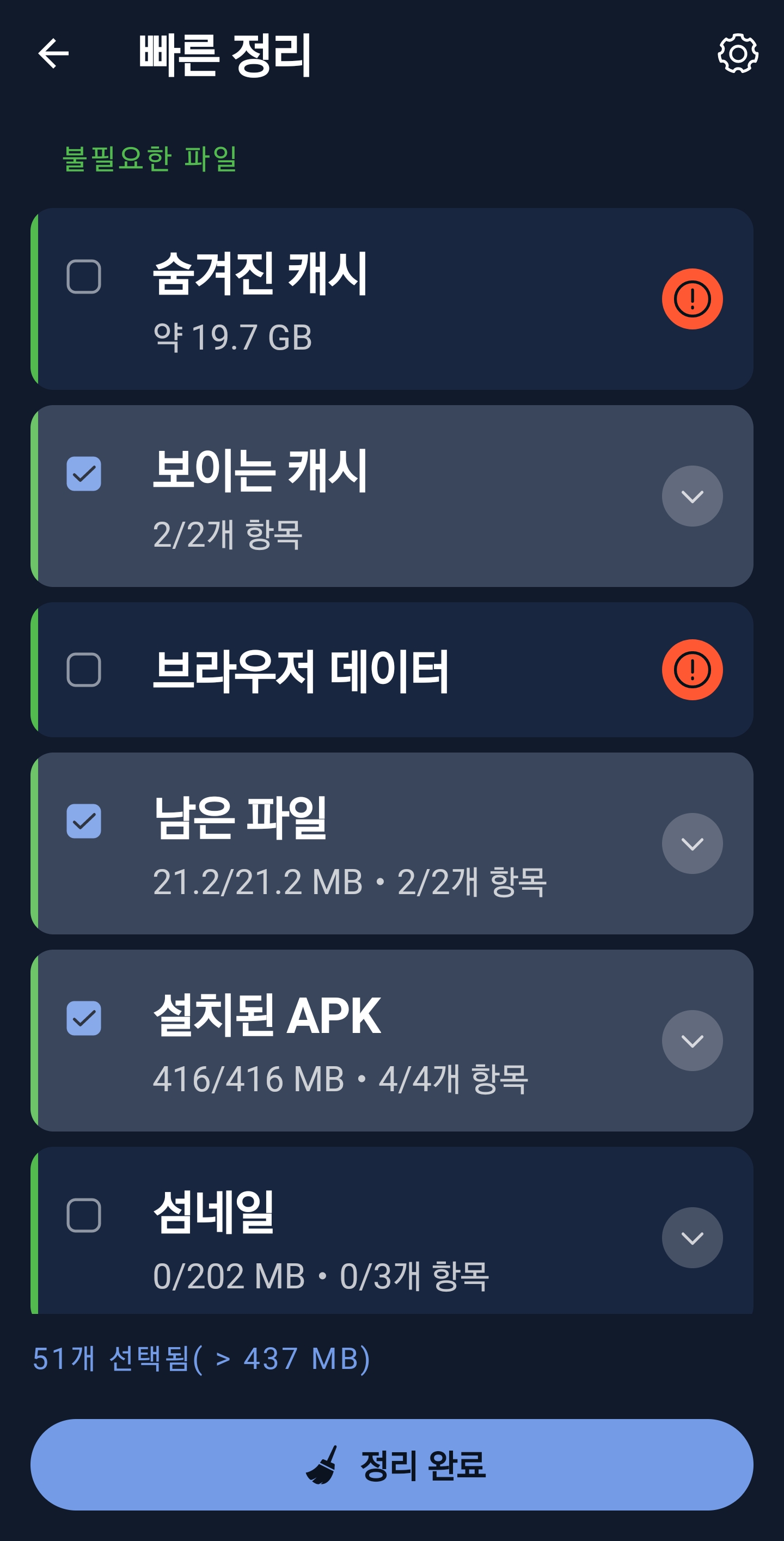 앱 설치가 완료되면 열기 를 누릅니다. 자동으로 CCleaner가 실행됩니다. 불필요한 파일 리스트가 뜨는데, 정리 완료를 누르면 자동으로 불필요한 파일, 중복 파일을 정리하면서 폰 최적화를 실행합니다.