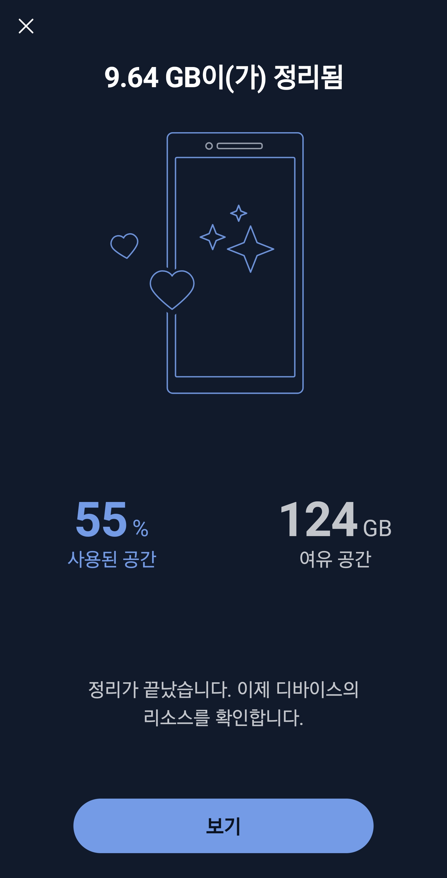 사용해 보니, 자동으로 9.64BG가 정리되었네요. 폰 속도도 조금 빨라졌습니다. 주기적으로 실행해서 폰 최적화를 진행하시면 됩니다.