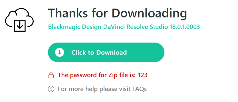 Direct Download를 클릭하면 몇 초 후 파일을 받을 수 있는 아이콘이 활성화됩니다. 클릭합니다. 파일 크기는 3.5GB입니다. 파일 다운로드가 끝나면 리졸브 스튜디오 18 설치를 시작합니다.