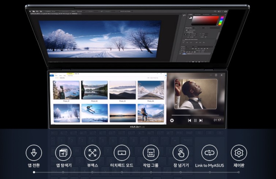 세컨드 스크린은 이런 식으로 활용하게 됩니다. 위에 포토샵 하나 띄우고 밑에는 파일탐색기 하나 띄우죠. 아수스 내에서 어떻게든 활용해 보라고 여러 기능들을 넣어두었는데, 잘 쓰게 될지는 의문입니다.