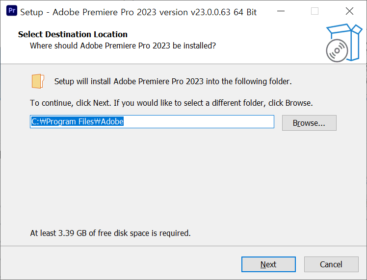 프리미어 프로 2023 설치 프로그램입니다. 원하는 설치 위치를 설정하고 설치를 진행합니다.