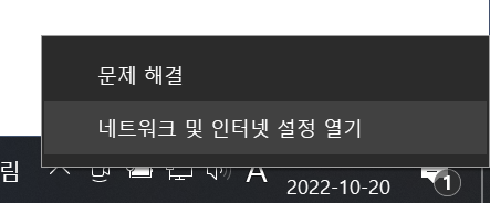 윈도우 10과 11에서 랜선을 뽑지 않고 인터넷 연결을 해제하는 방법입니다. 하단 우측에 있는 이더넷 아이콘에 마우스를 대고 오른쪽 버튼을 누릅니다. 네트워크 및 인터넷 설정 열기 를 클릭합니다.