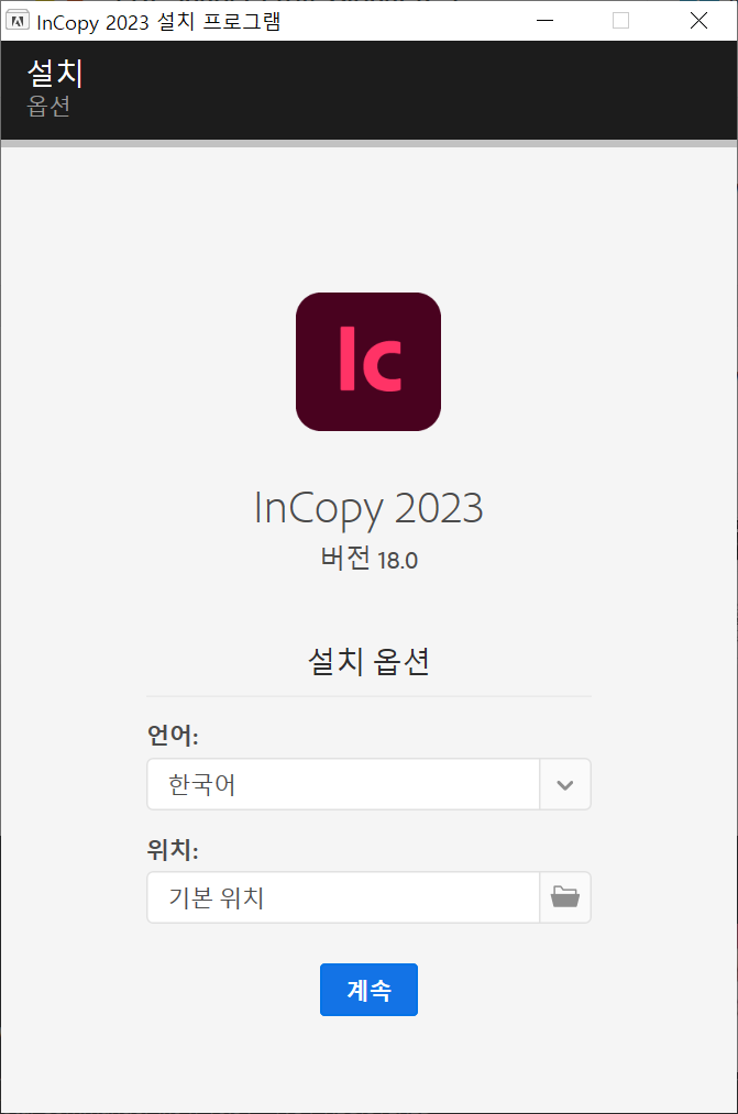 InCopy 2023 설치 프로그램입니다. 설치할 언어와 설치 위치를 설정한 후 계속 을 클릭합니다. 설치가 끝나면 인카피 2023 설치 프로그램을 종료합니다.