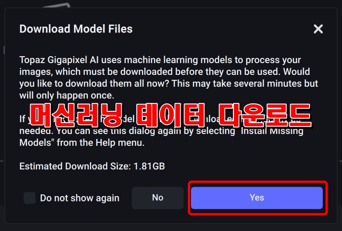 Topaz Gigapixel 을 실행하면 추가 데이터 다운로드 메시지가 나옵니다. 업스케일링에 필요한 머신러닝 데이터를 다운받는 과정입니다. Yes를 클릭하면 추가 데이터를 다운로드 및 설치합니다.