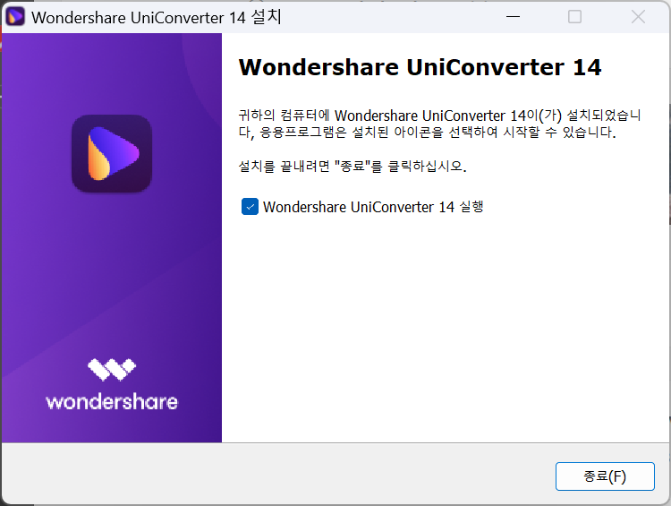 설치가 끝나면 종료합니다. 단, Wondershare Uniconverter 14 실행 에는 체크가 해제되어 있어야 합니다. 크랙을 깔아야 하기 때문이죠.