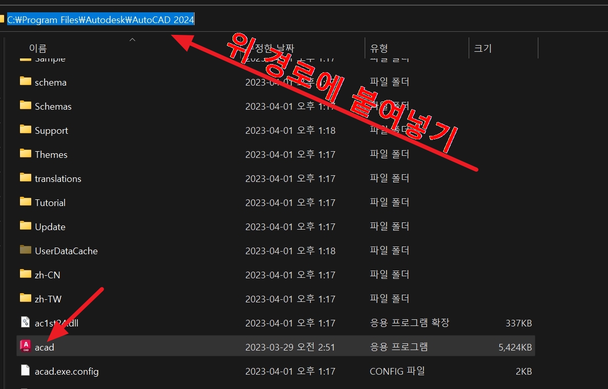 C:Program Files/Autodesk/Autocad 2024 경로에 붙여넣기 합니다. 관리자 권한이 필요할 수 있습니다.