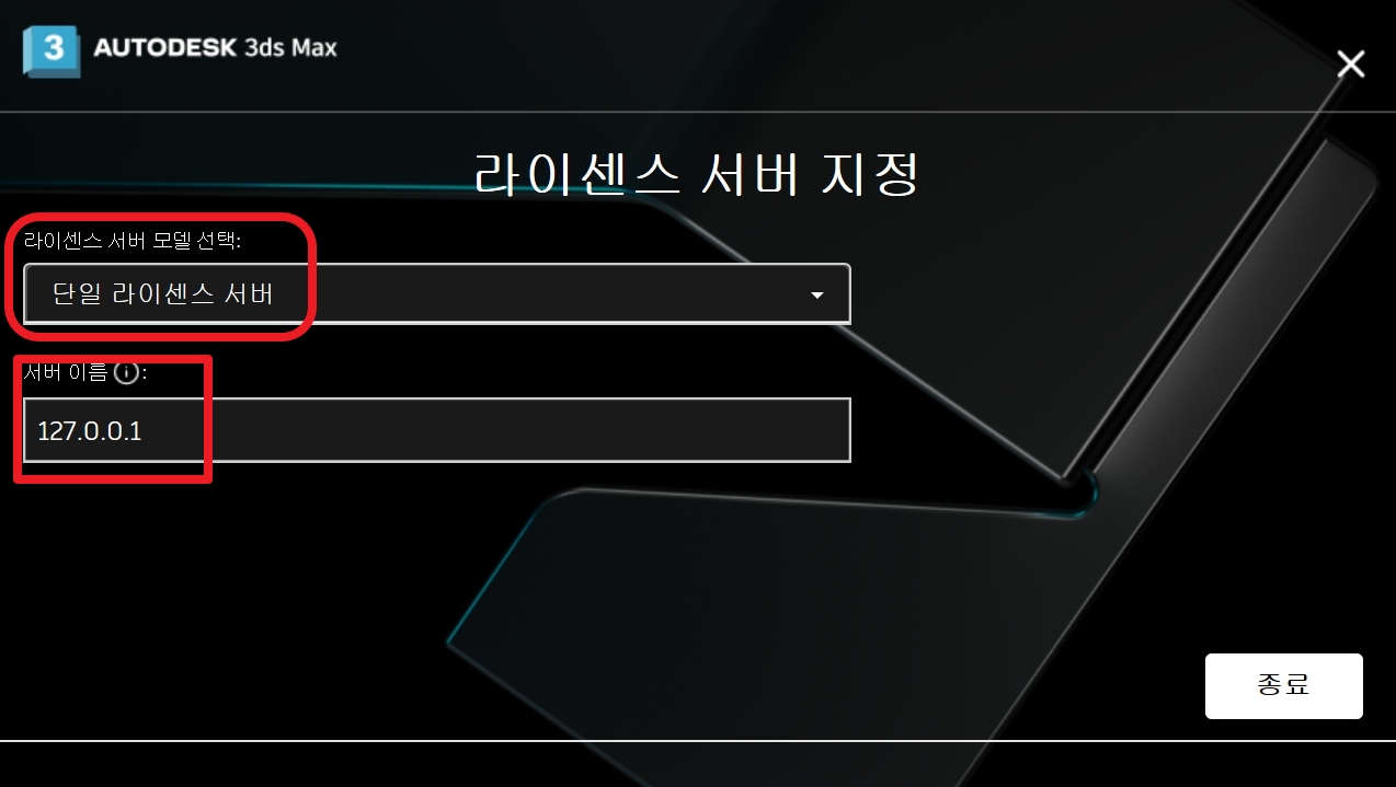 단일 라이센스 서버를 클릭하고 서버 이름은 127.0.0.1을 입력합니다.