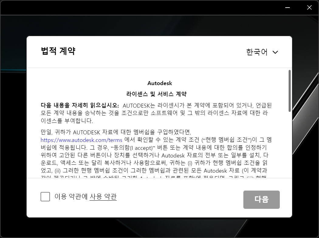 3DS MAX 2024 설치 프로그램입니다. 사용약관에 동의 후 다음 을 클릭합니다.