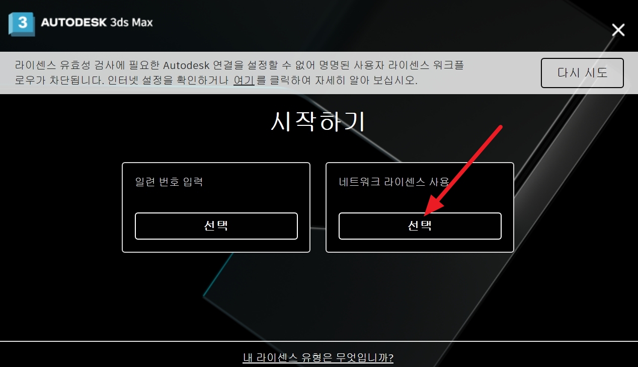 실행 도중에 인증 창이 나옵니다. 네트워크 라이센스 사용을 클릭합니다.