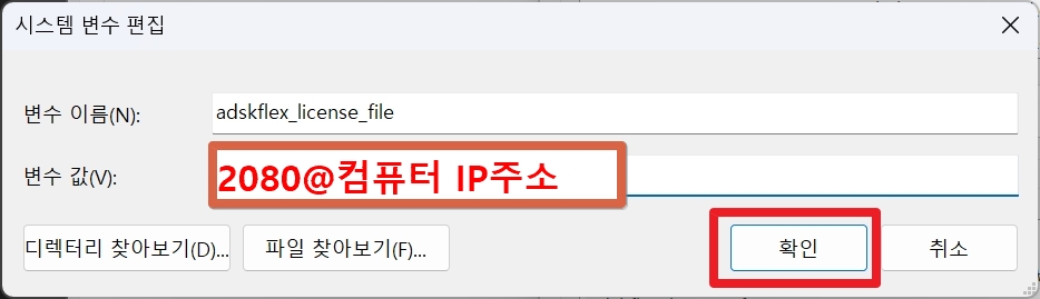 변수 이름은 asdkflex_license_file로 하고 변수 값은 2080@사용중인 컴퓨터 IP주소 를 입력합니다.