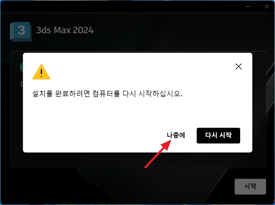 설치가 끝나면 컴퓨터를 다시 시작하라는 메시지가 나옵니다. 나중에 를 클릭합니다.