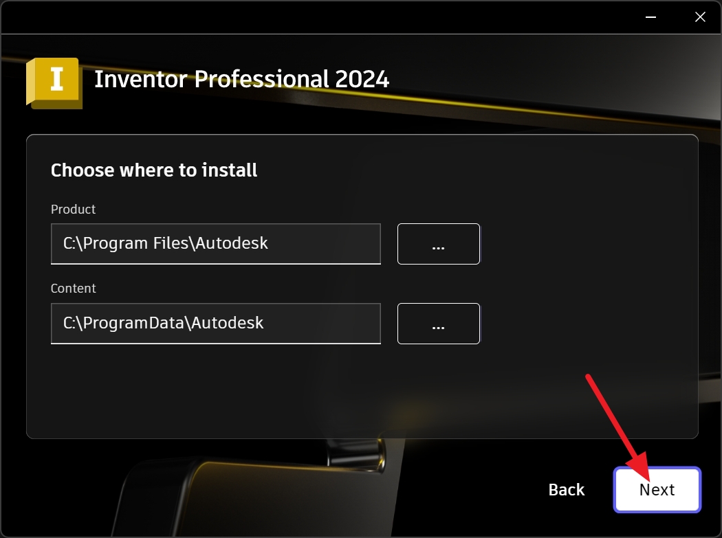 인벤터 2024 설치 위치를 설정합니다. 설정 후 .Next를 클릭합니다.
