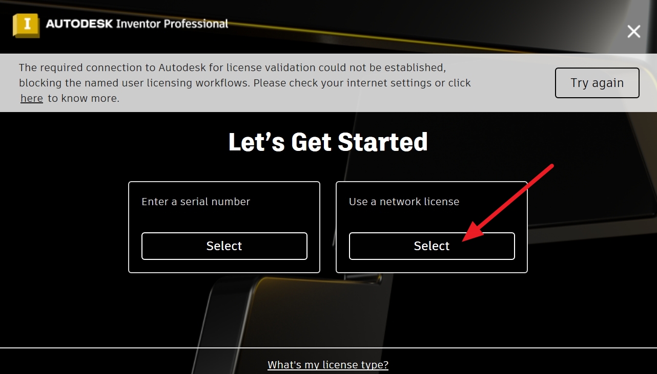 크랙 설치 후, 인벤터 2024를 실행하면 라이센스 메뉴가 나옵니다. Use a network license 내에 있는 Select를 클릭합니다.