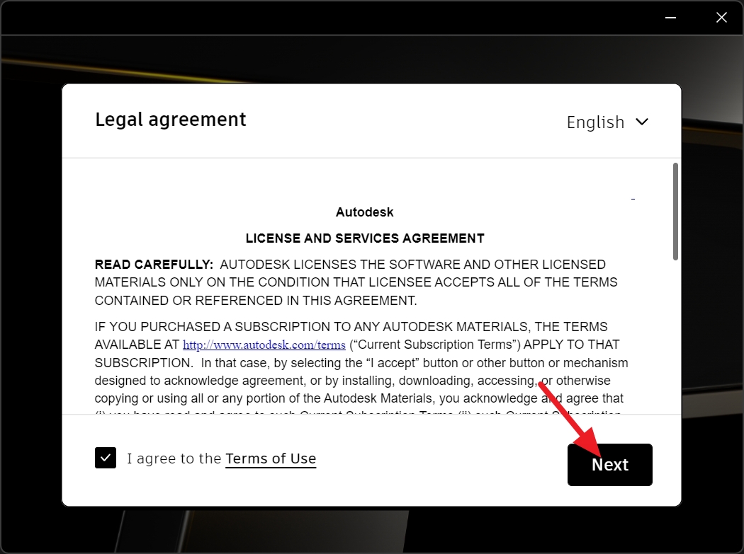 인벤터 2024 설치 프로그램이 실행되었습니다. 사용 약관에 동의하고 Next를 클릭합니다.