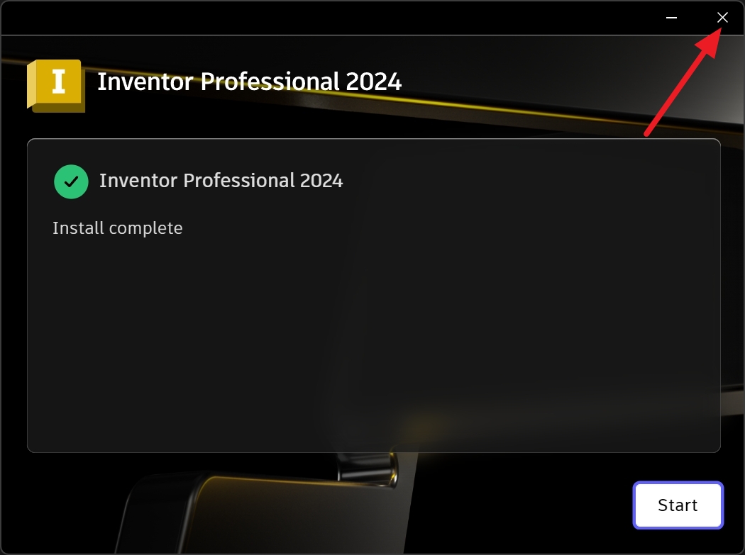 인벤터 2024 설치가 끝났습니다. 우측 상단에 있는 X를 클릭합니다. (start는 누르지 않습니다.)