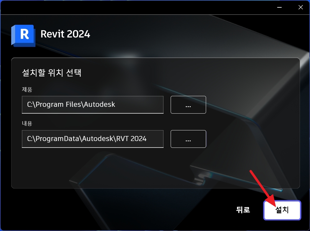 Revit 2024 설치 위치를 설정합니다. 설정 후 설치 를 클릭합니다.