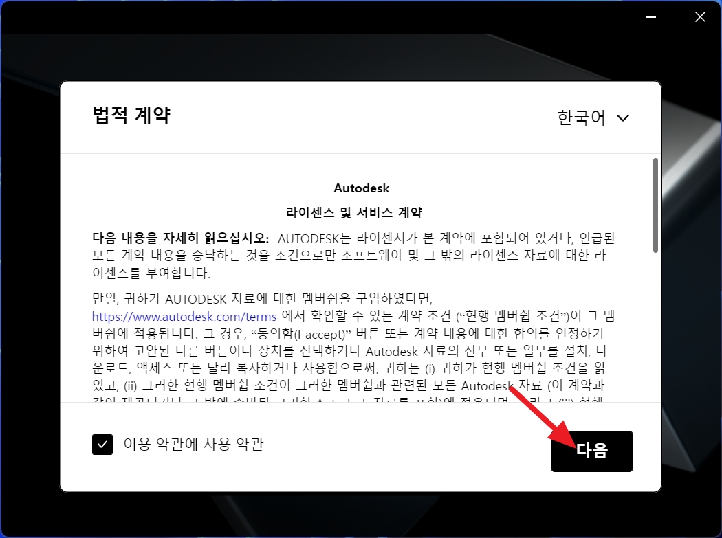 Revit 2024 설치 프로그램입니다. 사용 약관에 동의한 후 다음 을 클릭합니다.
