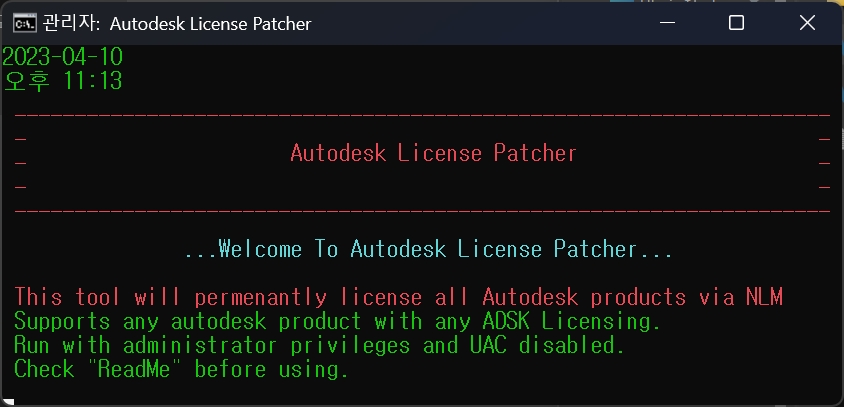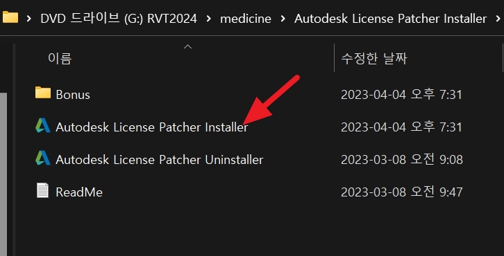 이제 인증을 할 차례입니다. 마운트 한 이미지 내 medicine 폴더 내에 있는 Autodesk License Patcher Installer를 실행합니다.