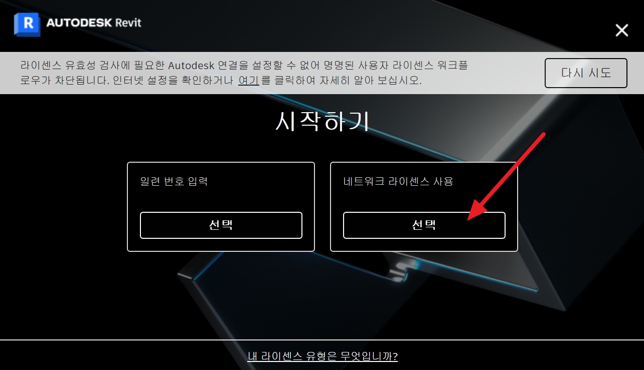 라이센스 인증 창이 뜹니다. 네트워크 라이센스 사용 선택 을 클릭합니다.