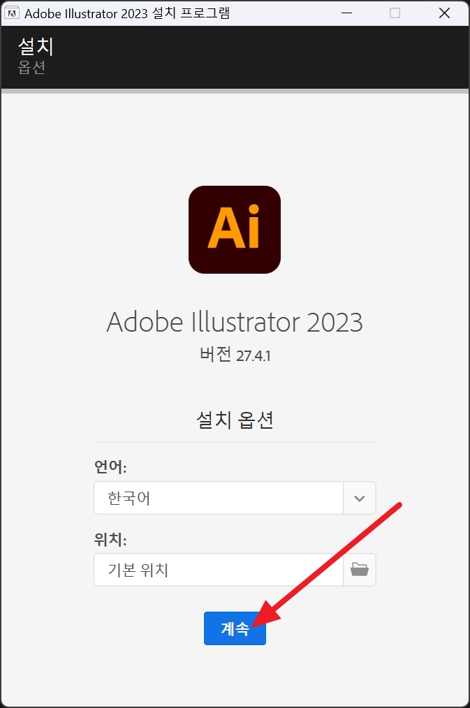 Adobe illustrator 2023 설치 프로그램입니다. 설치할 위치와 설치 언어를 선택한 후 계속 을 클릭합니다. 설치 시간은 1~2분 입니다.