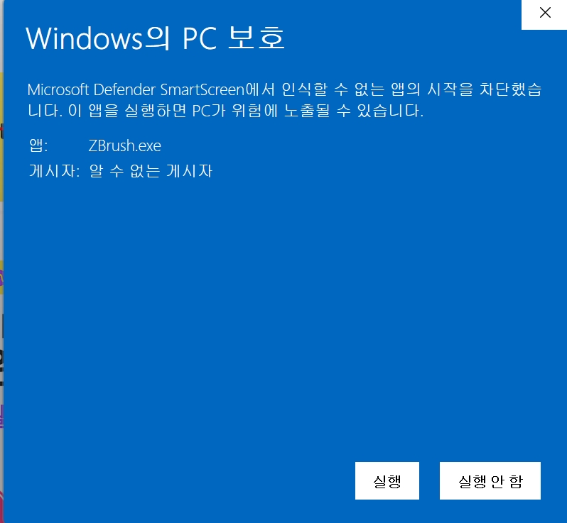 처음 지브러시 2023을 실행하면 경고창이 뜹니다. 무시하고 실행을 클릭합니다.